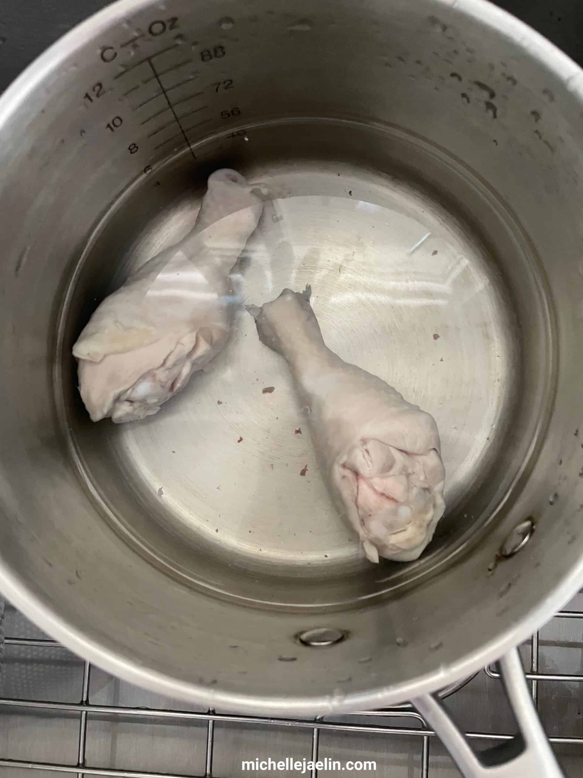 - Submerge chicken drumsticks in a pot of cold water. Bring water to a boil and boil for 4-5 mins. You want the impurities (foam and scum) to release from the chicken. Remove from heat, discard the water. Rinse the boiled chicken and pot to remove extra foam and scum.