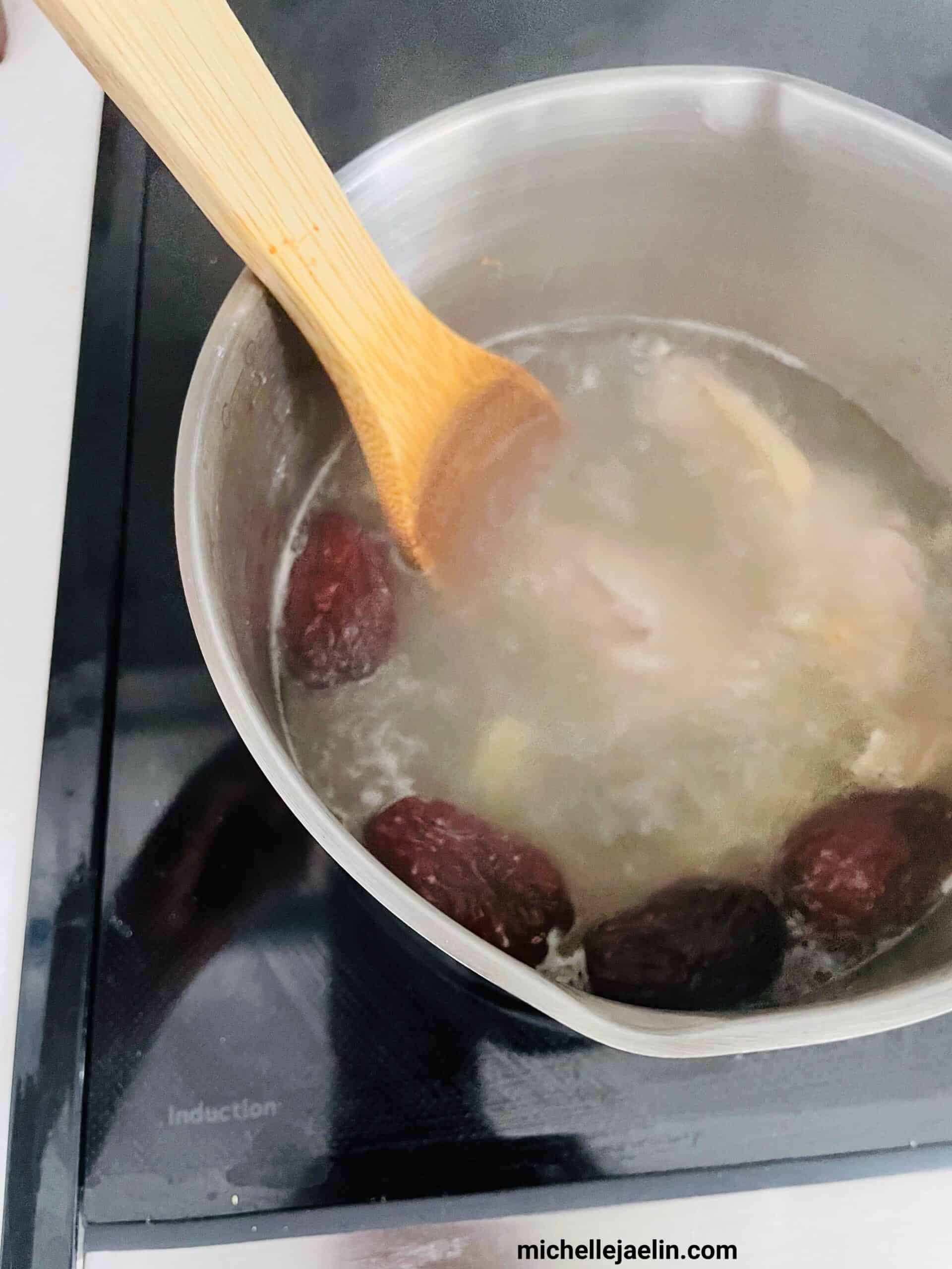 - Add sliced ginger, ginseng flakes and red dates. Once the soup is boiling, turn the heat down to simmer for 1 hour.