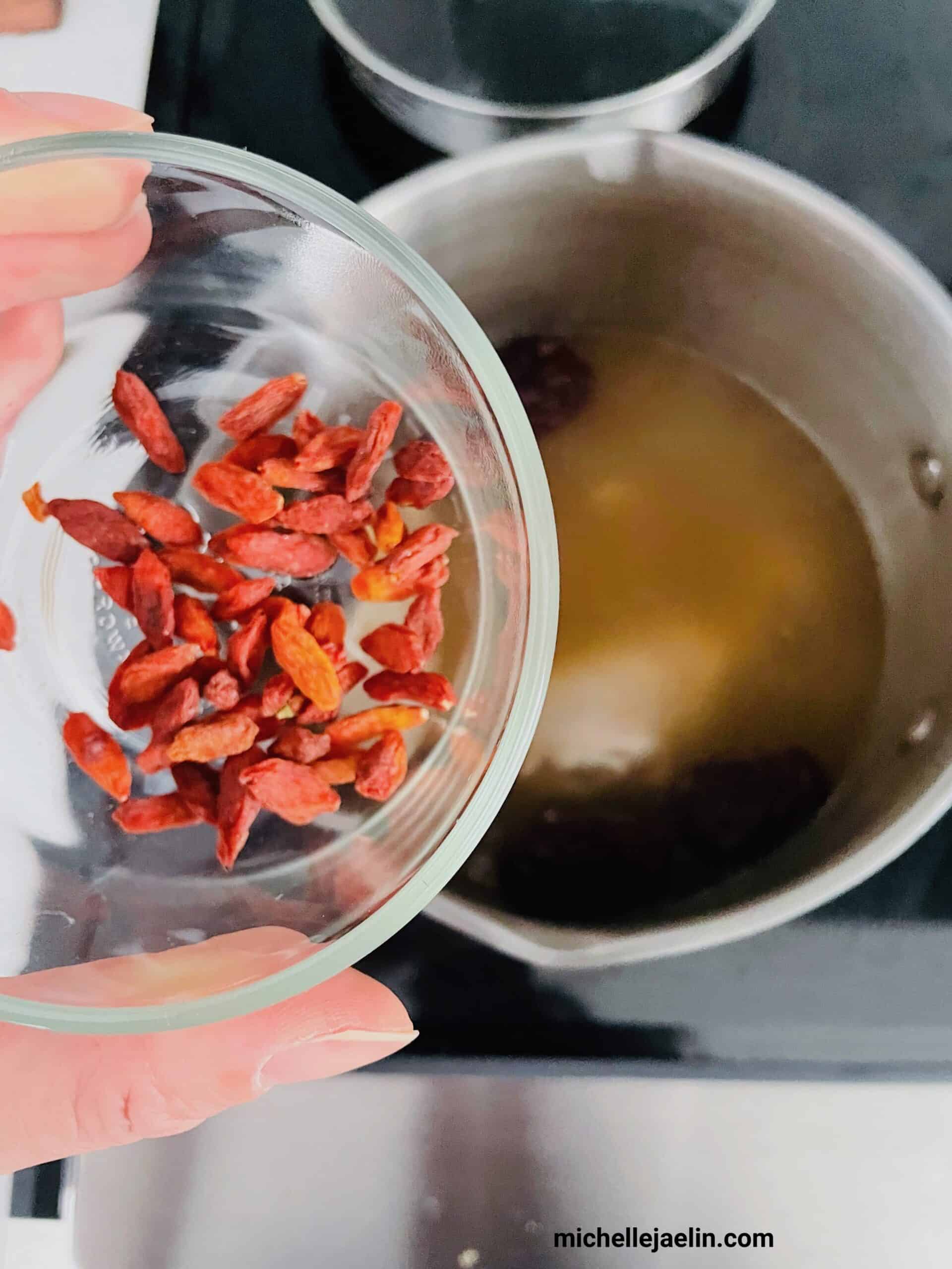- Step 7: For the last 5 minutes of simmering time, add goji berries.