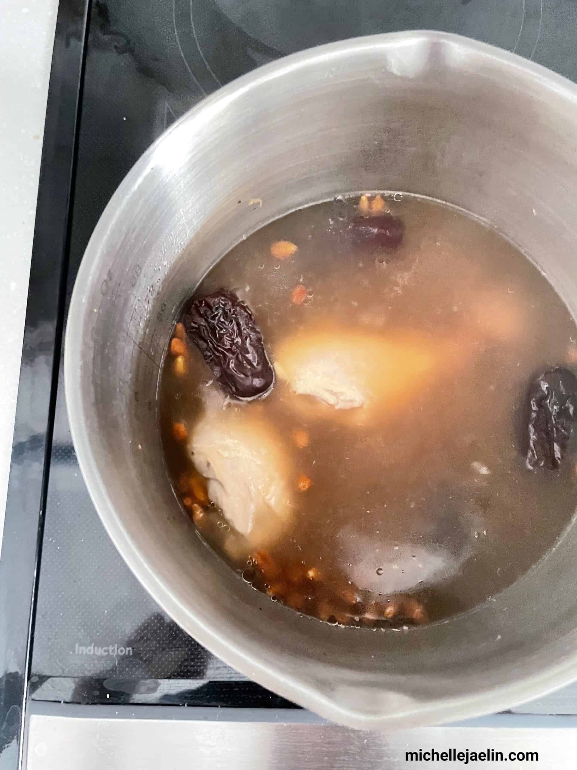 - Using a Chinese clay pot (or the same pot from before), add the chicken and add 6 cups of water. Note at how the water from this step is much clearer than the previous step. Turn the heat to high and bring the soup to a boil.